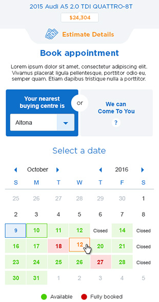 Clearly defining the selling process, our team streamlined the initial data input steps for the user, decreasing disengagement (and ‘cart abandonment’), encouraging the crucial next step of vehicle valuation, and appointment booking.